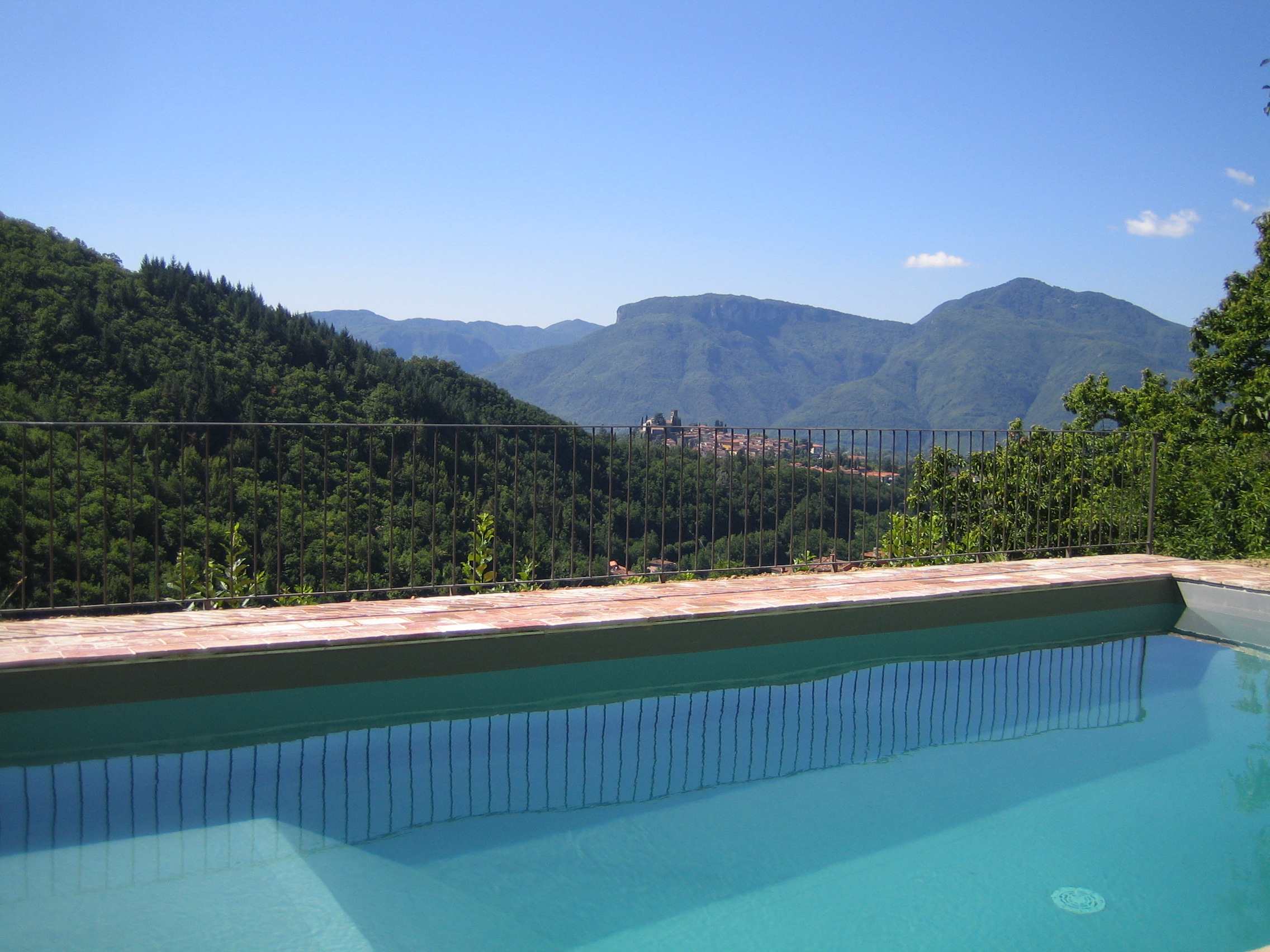 This beautiful house is known locally as Paradiso for obvious reasons! with 10x4 swimming pool and spectacular views It is set on the side of a mountain covered in chestnut trees and looks down onto Barga and across to the spectacular peaks of the Marble Mountains, the Apuan Alps. The house itself is the highest of three houses on an ancient paved mule track - an old Roman road - which is narrow but perfectly drivable in not too wide a car. The house is large and comfortable. It is set over two floors, with cantinas below. On the upper floor there are three bedrooms, one with a double bed and a bathroom attached, the others with twin single beds. Downstairs there is a further double bedroom, a large sitting room and a large kitchen with dishwasher. Off the kitchen is another bathroom and a small room with a clothes-washing machine on the right and an electric water heater for the bathrooms and kitchen. Distances Lucca - 35km Pisa - 55km Florence - 110 km Coast - 55km