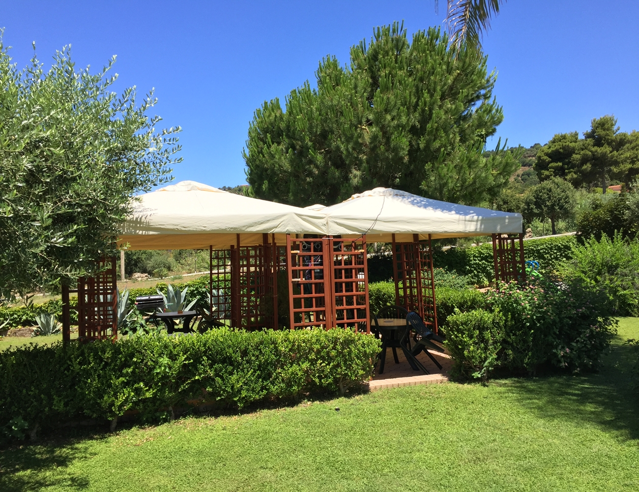 Terrassmöbler med solstol, fåtölj, uteplatsbord, sex stolar och en gasolgrill.