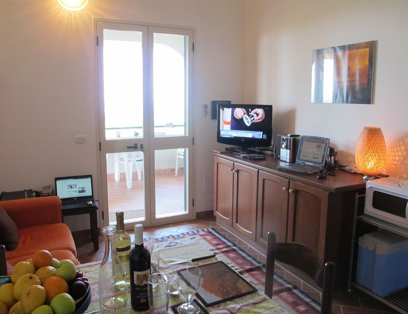 Platt-TV med digital tuner, DVD-spelare, stereo mini hi-fi med CD-spelare, kassettband och tuner, bärbar dator, liten datorförstärkare för MP3/iPod.