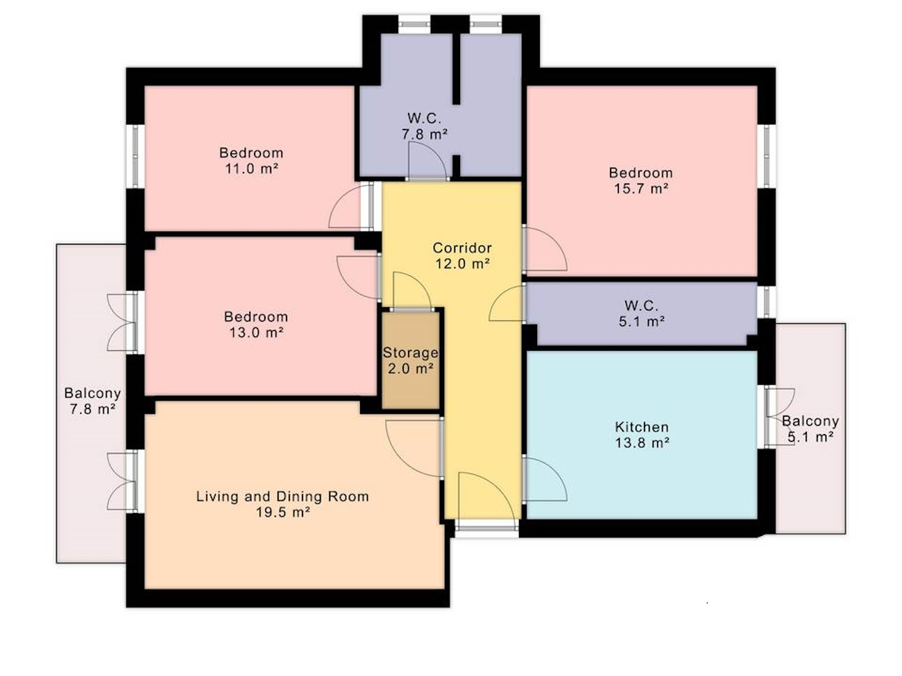 - 4-rumslägenhet bestående av: hall, vardagsrum, kök, tre sovrum, två badrum. Två balkonger.