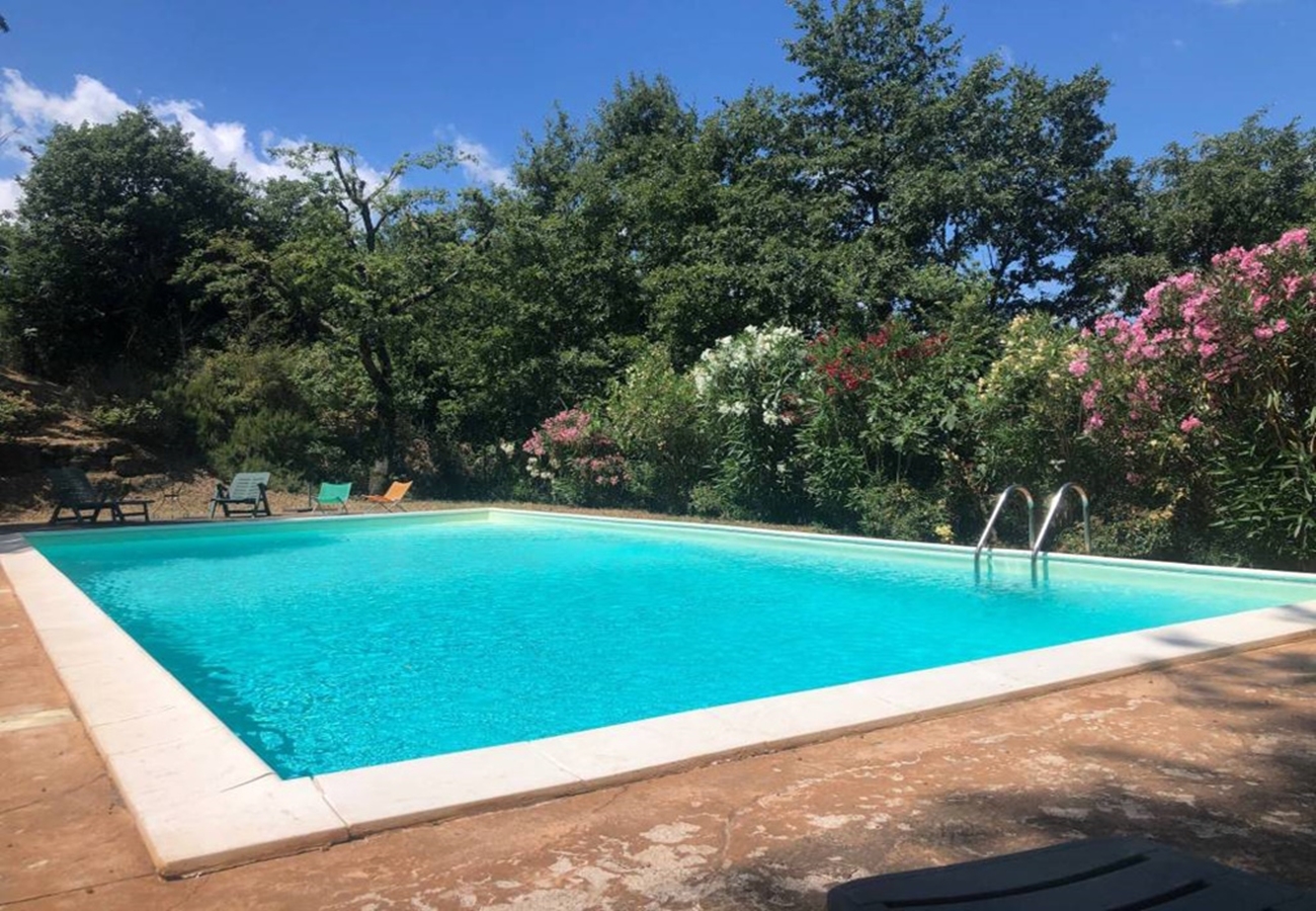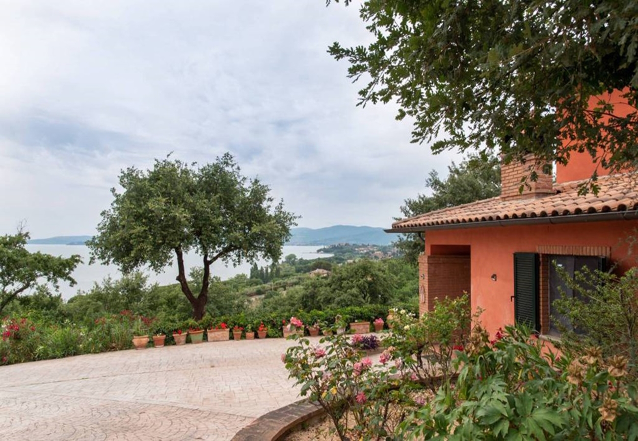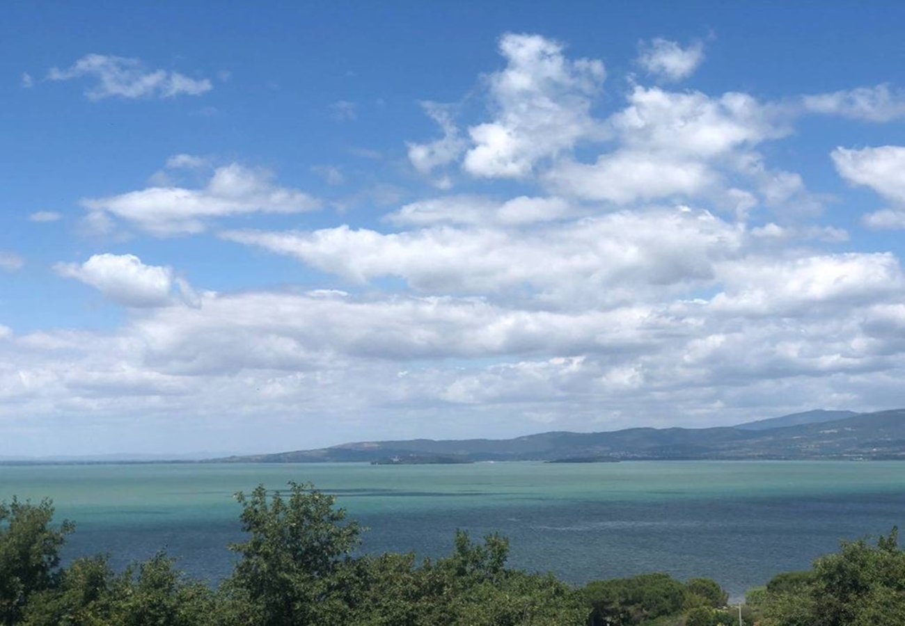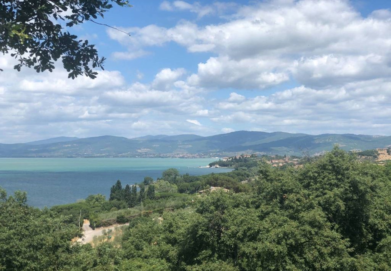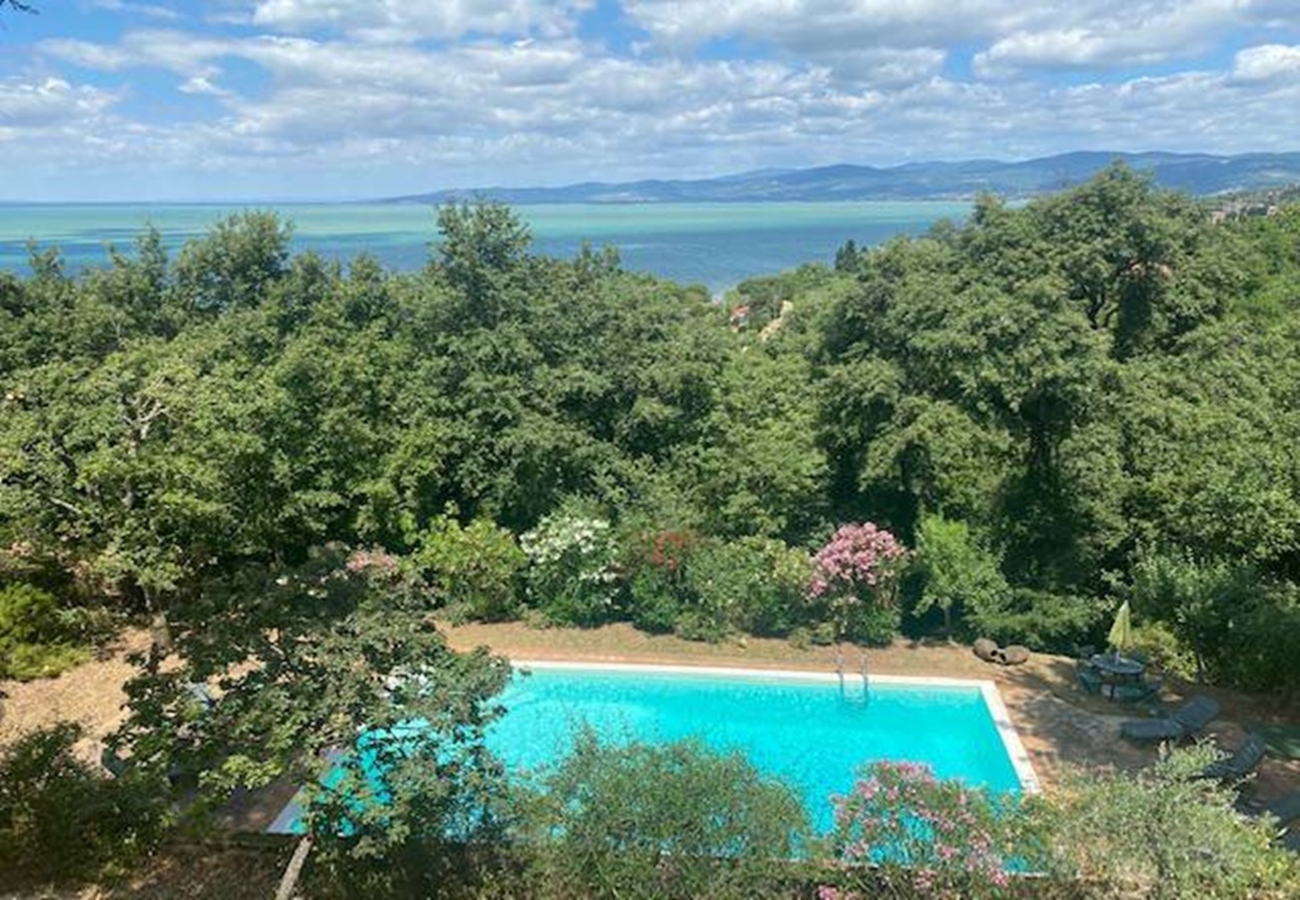 Fin villa med pool med sjöutsikt till salu i San Savino. Villan har stor mark, trädgård med pool och en underbar utsikt över Trasimenosjön och dess öar.