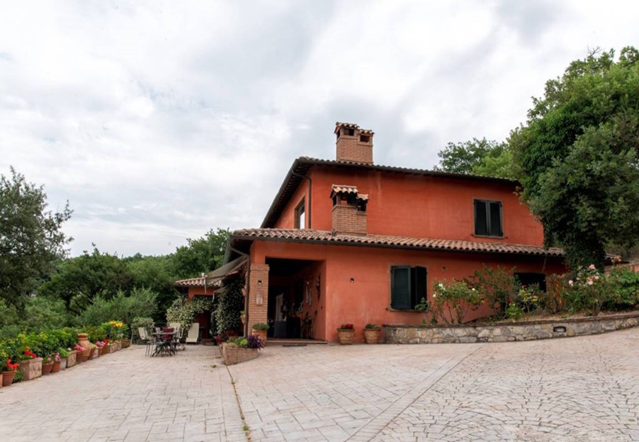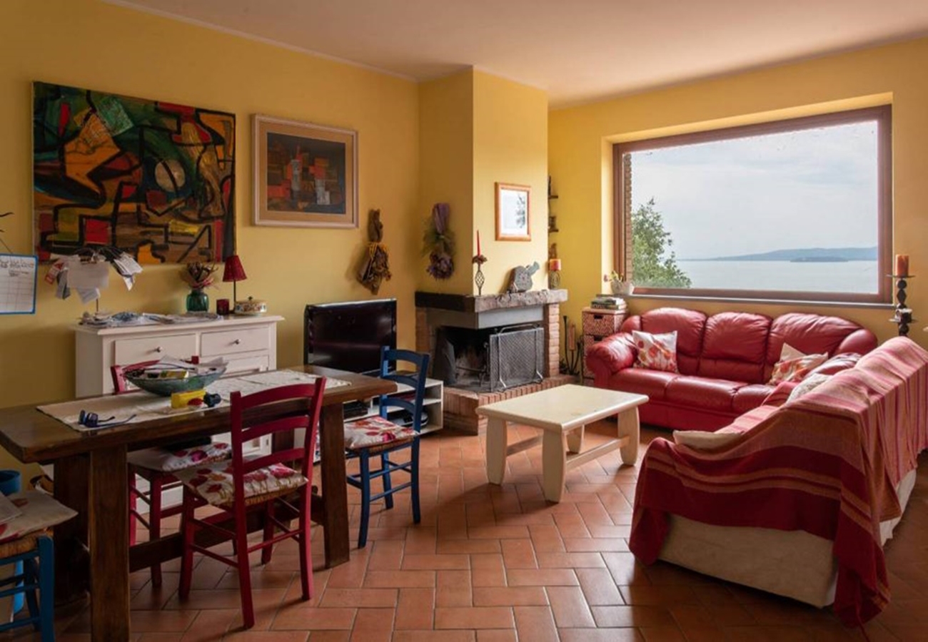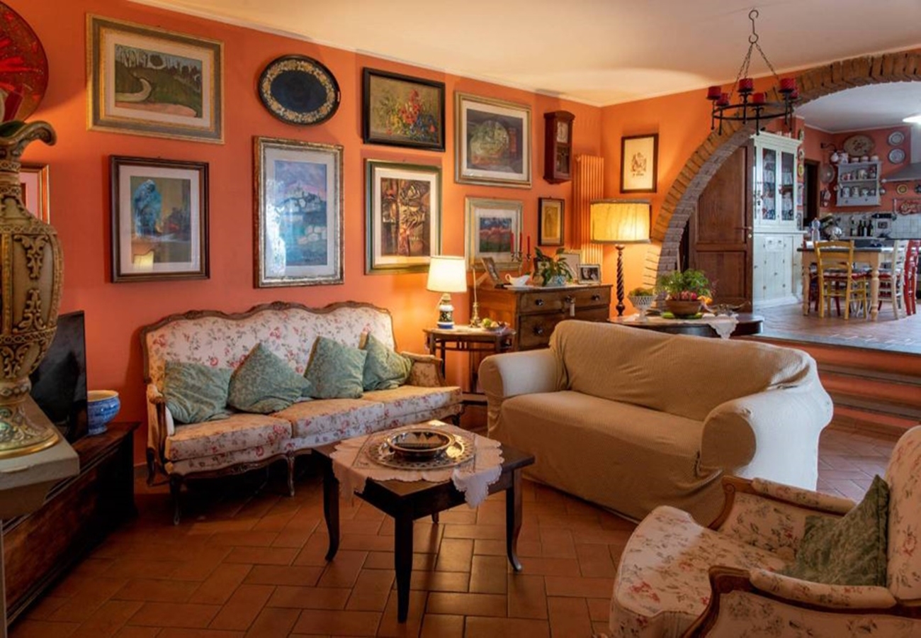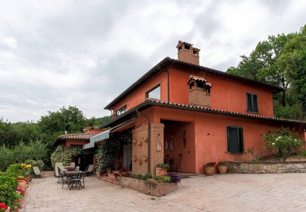 Fin villa med pool med sjöutsikt till salu i San Savino. Villan har stor mark, trädgård med pool och en underbar utsikt över Trasimenosjön och dess öar.
