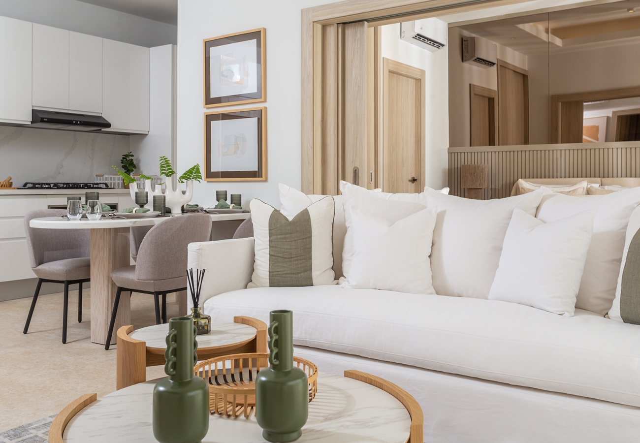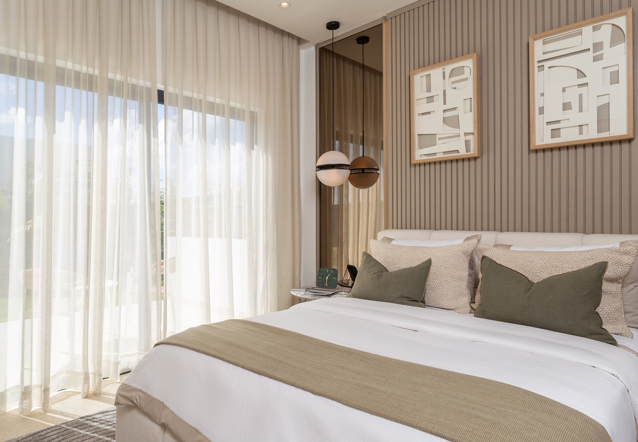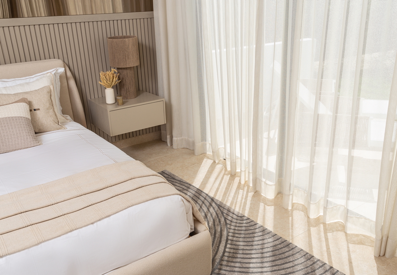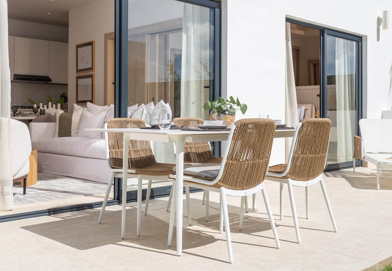 - 3-rumslägenheter med entréhall, fullt utrustat kök med alla köksmaskiner,, vardagsrum och matsal med A/C och access till rymlig terrass och två sovrum med A/C, fullt utrustade 2 helkaklade badrum, samt gästtoalett