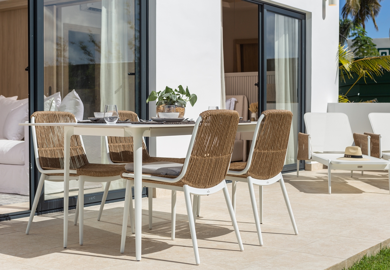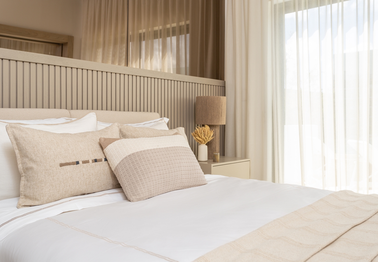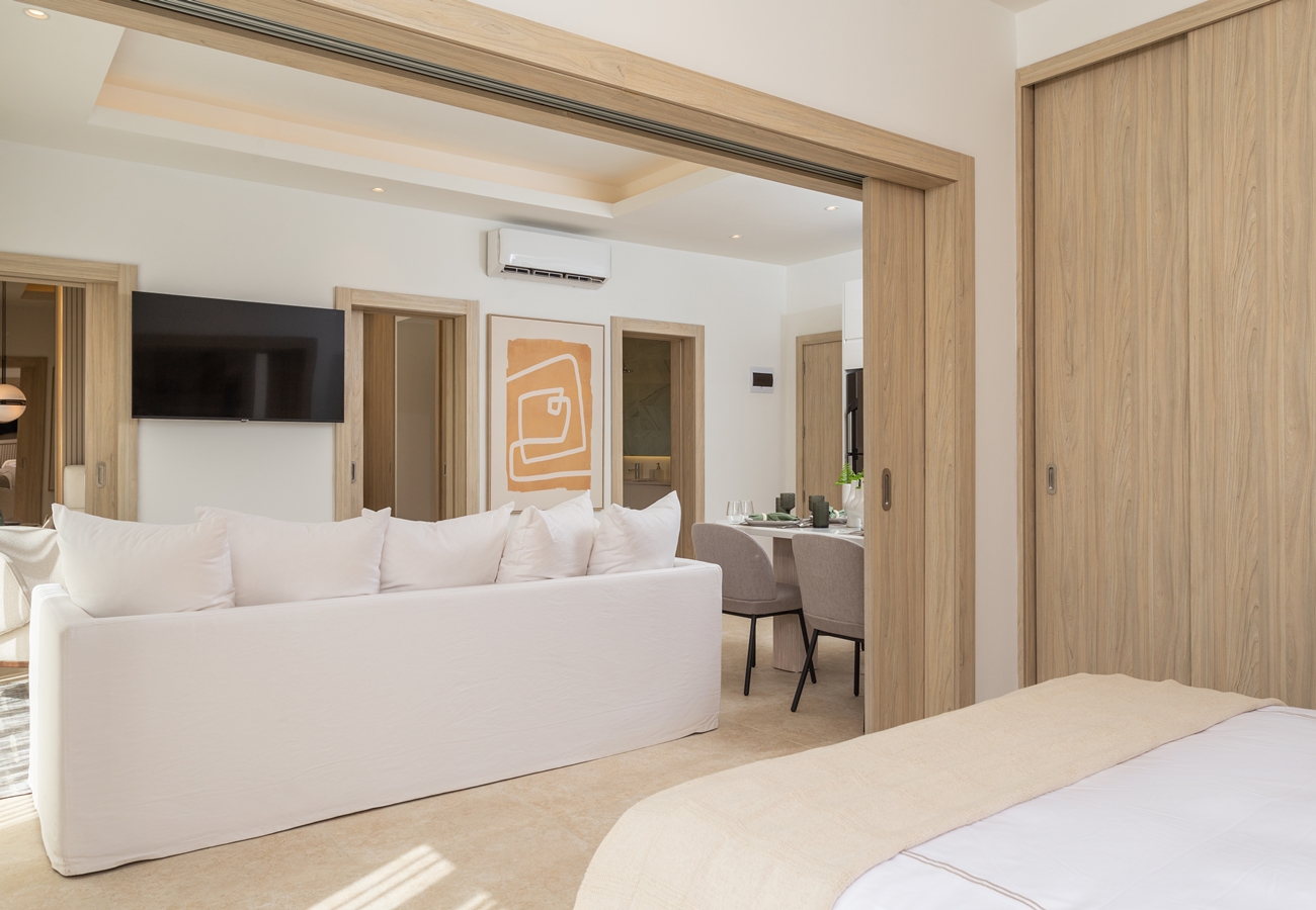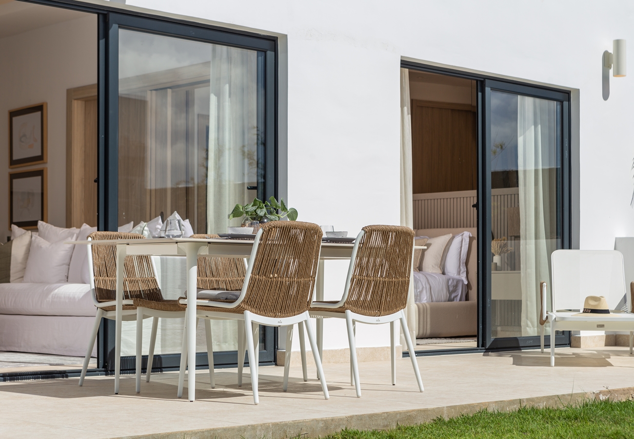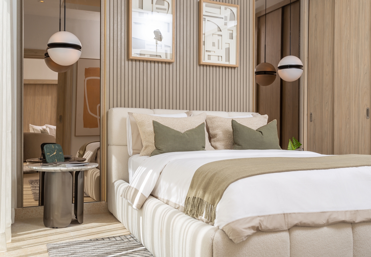 - 3-rumslägenheter med entréhall, fullt utrustat kök med alla köksmaskiner,, vardagsrum och matsal med A/C och access till rymlig terrass och två sovrum med A/C, fullt utrustade 2 helkaklade badrum, samt gästtoalett